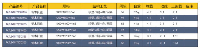四向三腿——鋼木托盤 技術(shù)參數(shù)說明: 產(chǎn)品編號(hào): AATJD4ⅢY1212165 產(chǎn)品規(guī)格: 1200*1200*165 產(chǎn)品自重: 45kg 防銹工藝: 靜電沙紋噴塑 產(chǎn)品靜載: 3000KG(均勻載重) 產(chǎn)品動(dòng)載: 2500KG(均勻載重) 產(chǎn)品上架: 1500KG(均勻載重) 主要用途: 倉庫、車間周轉(zhuǎn)、高庫物流倉儲(chǔ)